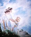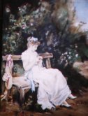 Obrazy różne Artystka tworzy nie tylko sztukę sakralną, ale w jej malarstwie odnajdujemy bogactwo innych tematów. kliknij na obraz, aby powiększyć  | Kobieta na ławce Olej na płótnie |  | Panny (kopia)