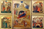 kliknij na obraz, aby powiększyć  | Cykl pięciu ikon przedstawiających sceny z życia Matki Bożej i dzieciństwa Chrystusa. Sceny te w Kościele Wschodnim występują jako ikony świąteczne, u katolików odpowiadają radosnym tajemnicom różańca i mogą być pomocą w jego odmawianiu. |  | Ikona Chrztu Pańskiego Przedstawia ideę teologiczną jaką jest teofania - objawienie Boga.
