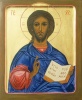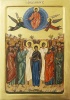 Ikona na nieokorowanej desce lipowej. |  | Ikona Wniebowstąpienia Przedstawia apostołów wraz z Maryją żegnających odchodzącego Chrystusa. Za Maryją dwóch aniołów w bieli. To ci, którzy rzekli do Apostołów: "Ten Jezus, wzięty od was do nieba, przyjdzie tak samo, jak Go widzieliście wstępującego do nieba". W górnej części ikony Chrystus jako Pantokrator, znajdujący się w centrum mandorli kosmicznej, unoszony jest do nieba przez dwóch aniołów. |  | Chrystus Pantokrator I poł. XIX w.